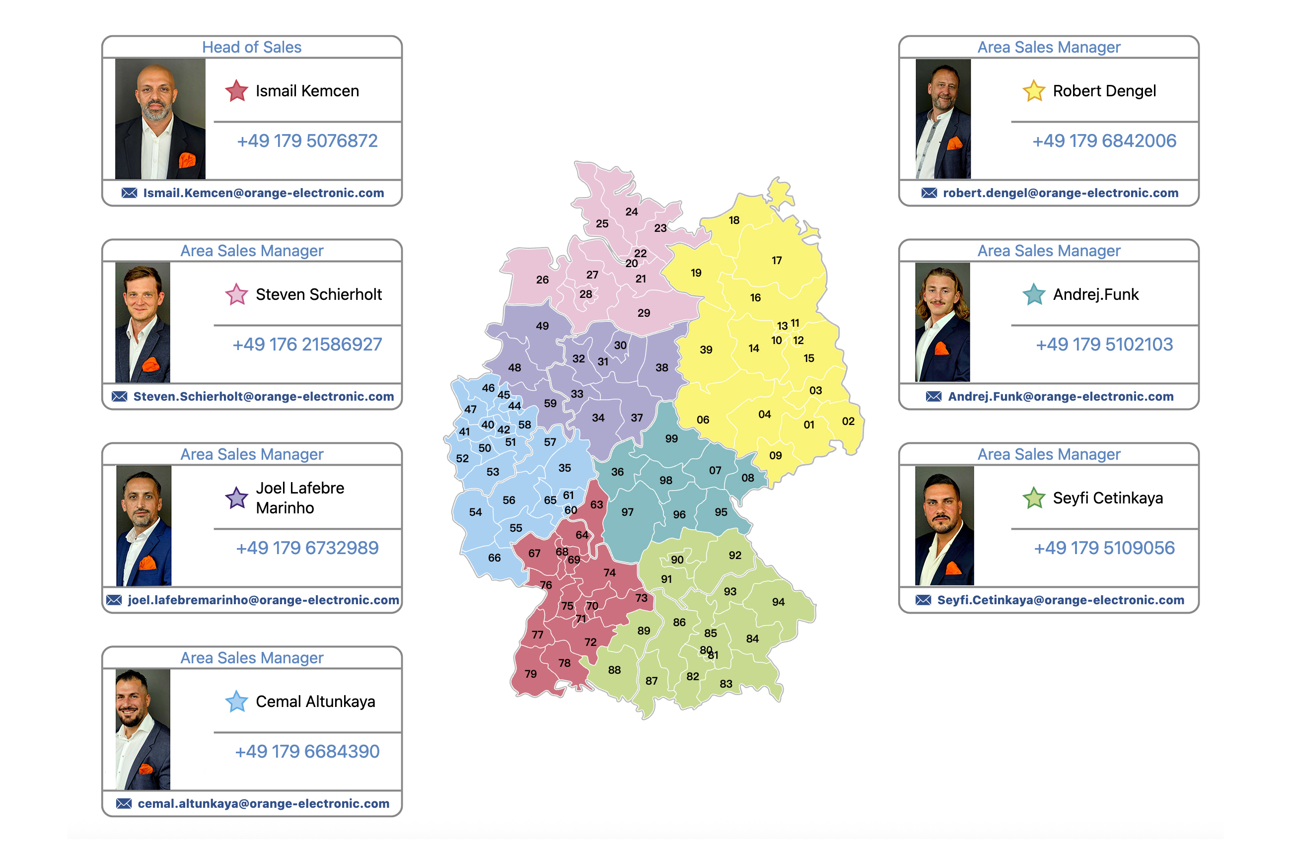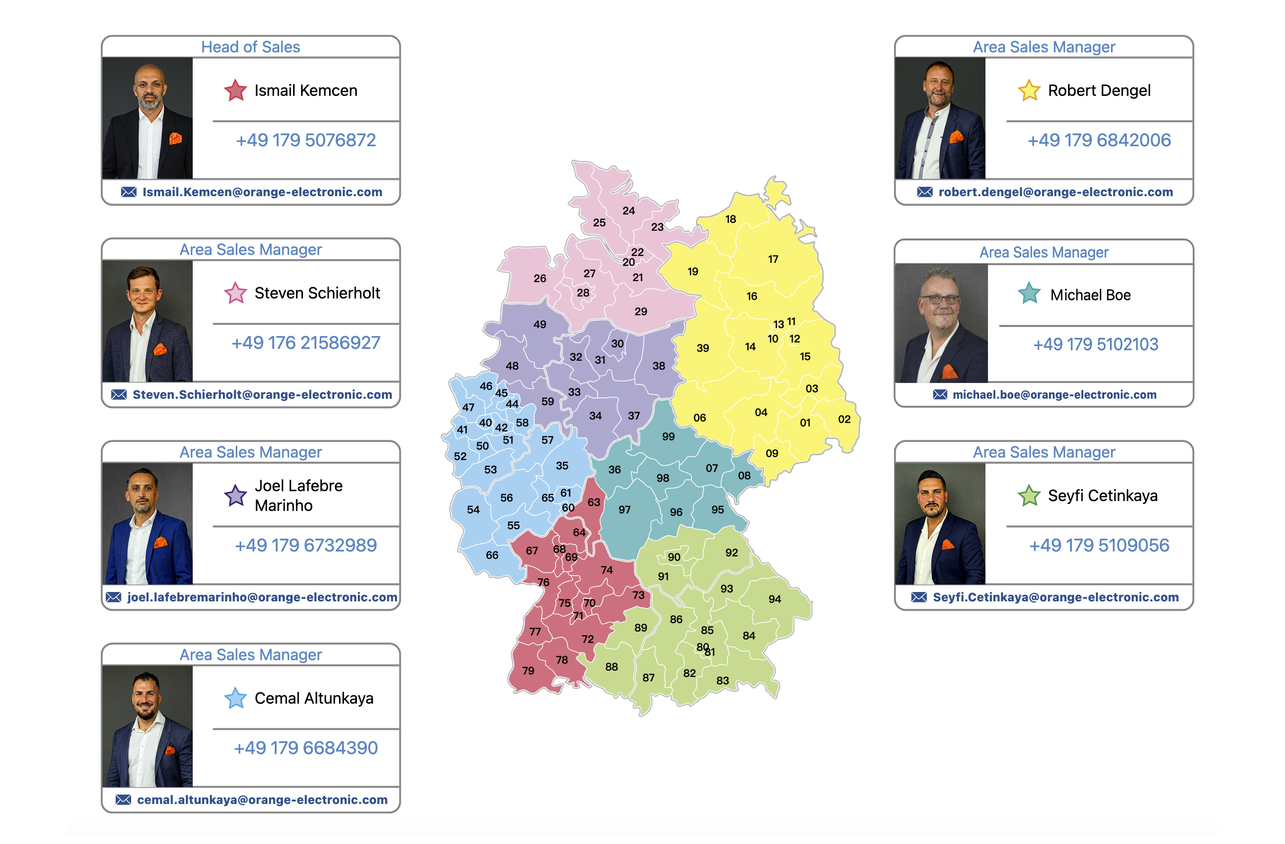 | Gebietsverkaufsleiter ➤ Cemal Altunkaya ➤ +49 179 6684390 ➤ cemal.altunkaya@orange-electronic.com |