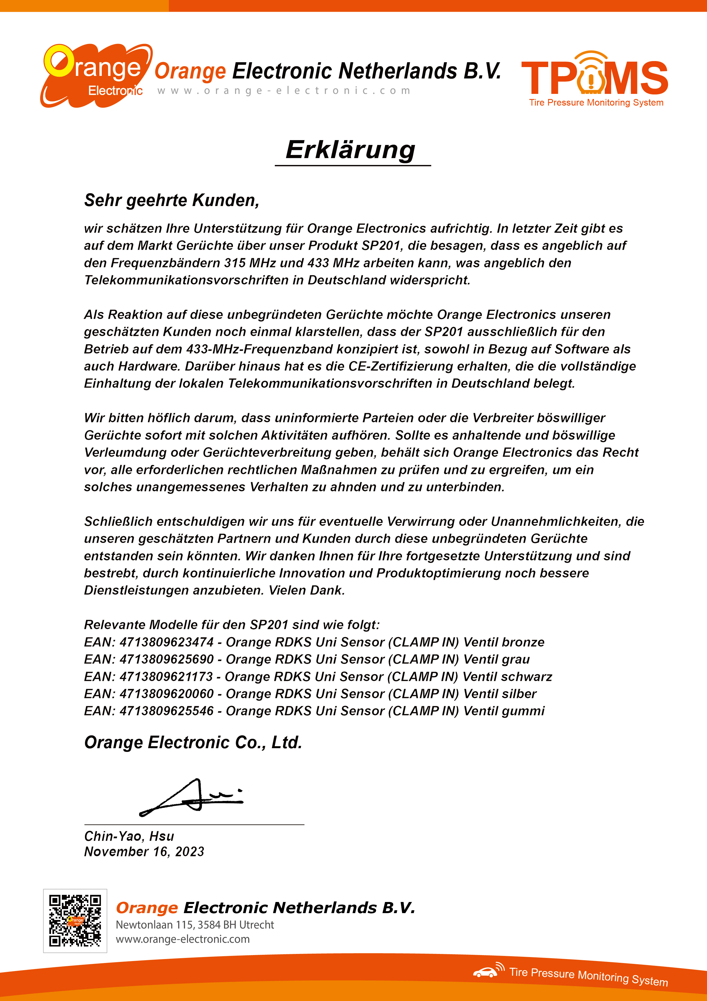 ● Offzielles Statement zu 315Mhz Sensoren